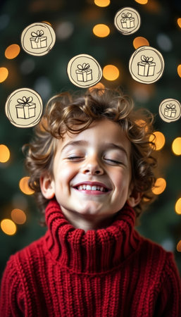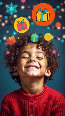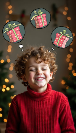 Smiling Boy Dreaming of Christmas Gifts with Festive Lights and Cartoon Gift Illustrations