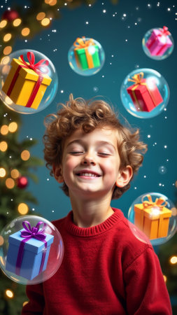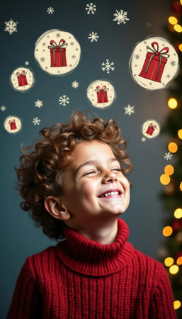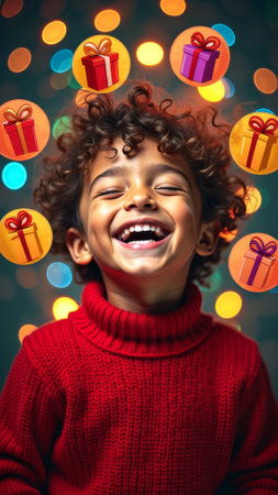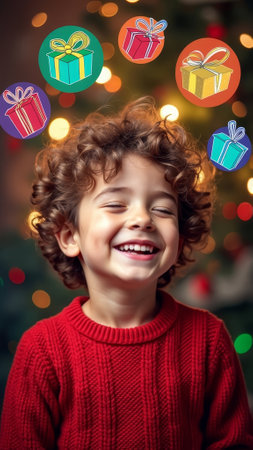 A delighted young boy wearing a red sweater looks up with a big smile, surrounded by twinkling holiday lights and gift decorations, embodying the joy of the Christmas season.