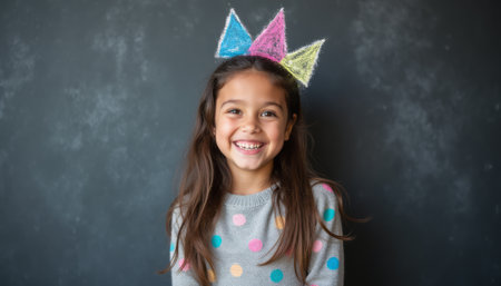 A cheerful young girl with long brown hair beams with joy, wearing a playful crown made of vibrant colors. Her polka dot sweater adds a fun touch, perfectly complementing her infectious smile against a dark backdrop.