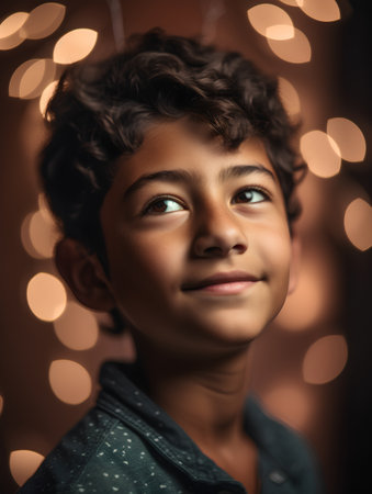 A delightful young Armenian boy stands against a backdrop of twinkling lights, radiating joy and innocence.