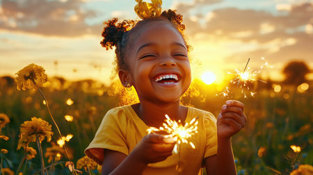A cheerful girl smiles widely while playing with a sparkler during sunset in a dandelion field, capturing a moment of pure joy and wonder.