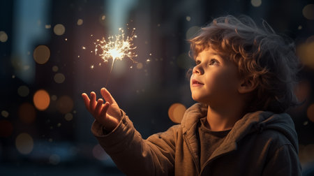 Excited little boy child holding sparkler stick looking at glitter in fascination generative ai