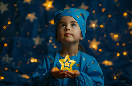 Cute little girl in blue pajamas with a star in her hands.