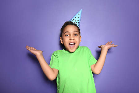 Portrait of cute little boy in party hat on color background
