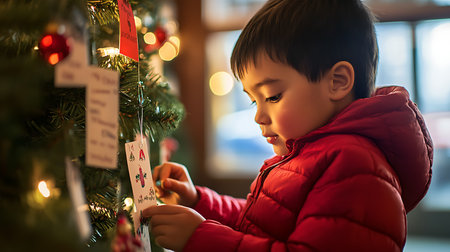 A little boy with curly hair closes his eyes with a beaming smile, imagining gifts, surrounded by festive decorations and a cheerful atmosphere.