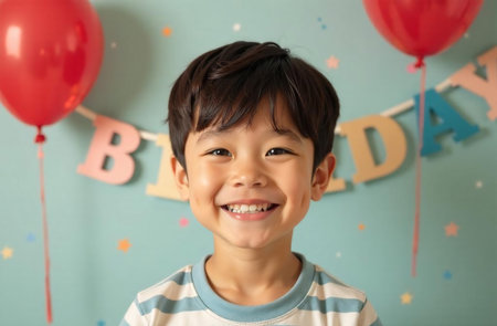 Happy Korean boy on birthday party with balloons on blue wall background