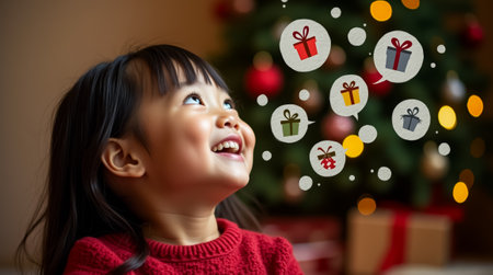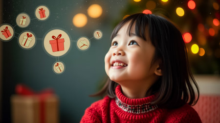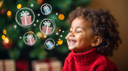 A young girl smiles brightly, captivated by the magical sight of illustrated gifts hovering around her, symbolizing the joy of the holiday season.