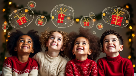 Four children gather together, looking up joyfully as they imagine holiday gifts. The cozy setting is adorned with twinkling lights and decorations creating a magical atmosphere.