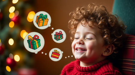 A cheerful little boy with closed eyes enjoys dreaming about colorful gifts, showcasing a big smile while sitting in a cozy, decorated space for the holidays.