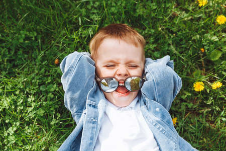 Top view spring child portrait. Funny kid smile and lay on grass. Outdoor funny face of little boy lying on fresh green grass. Summer fun, happy childhood.