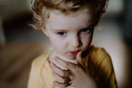 Portrait of beautiful pensive toddler girl with blonde hair at home. Sick kid sit in the bed. Scared little child in the room close-up. Sad baby is ill closeup. Healthcare concept