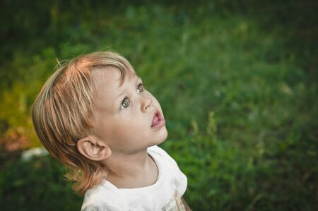 A little toddler boy standing outdoors on a meadow at sunset. Close-up.
