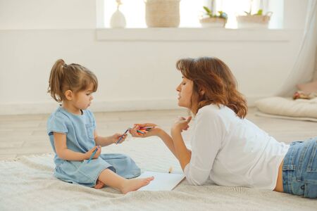 the concept of a healthy lifestyle, the protection of children, shopping - a teenager with a newborn baby playing together. Happy kids: sisters lying on the floor on white background. the view from the top