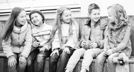 Group of happy joyful children standing together by a white brick wall. Kid's fashion. Warm clothing.