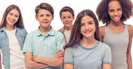 Attractive teenage girl is looking at camera and smiling, standing, isolated on white, other teenagers in the background