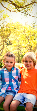 Happy cute children wearing white shirts. adorable girl is hugging her small brothers in the park. concept of love and family