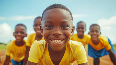 Children in vibrant sports uniforms warm up with smiles and stretches at sunny stadium before event