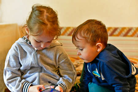 Curious baby boy and girl group studying with toy in modern room little boy and girl education
