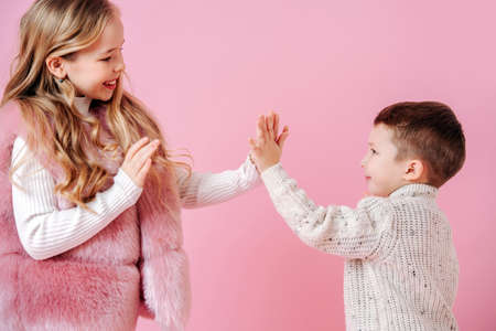 Siblings playing hand game. Younger brother and older sister. Over dark pink.