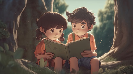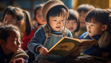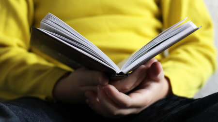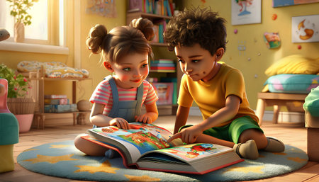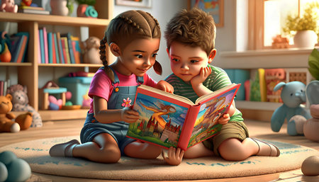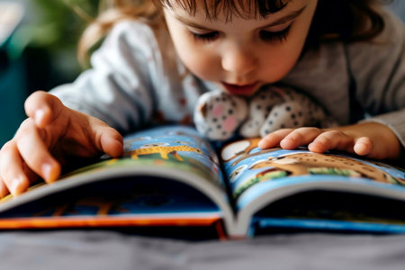 A young hand gently gestures toward vibrant picture pages, bathed in soft sunlight, capturing a peaceful, inviting atmosphere of childhood discovery.