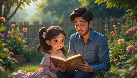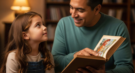 African American father reading storybook with daughter, both smiling at home. Family, bonding, storytelling, parenthood, happiness, childhood
