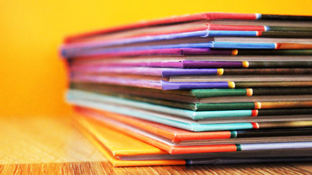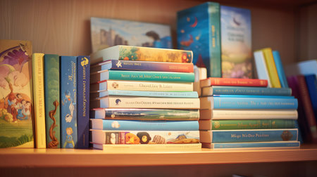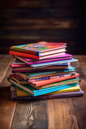Vibrant stack of books on wooden table against blue background symbolizing education and learning