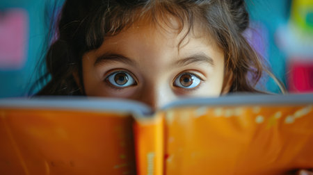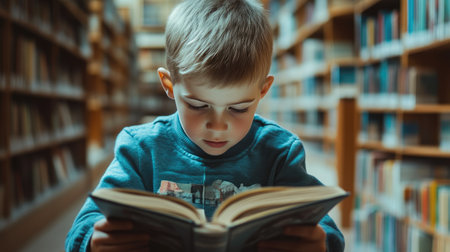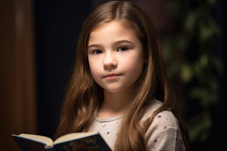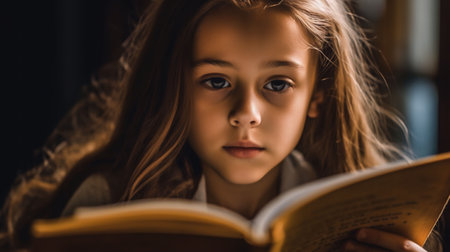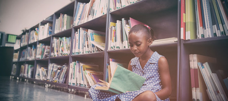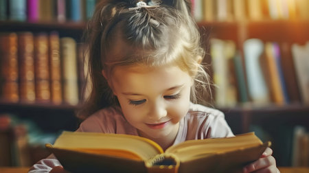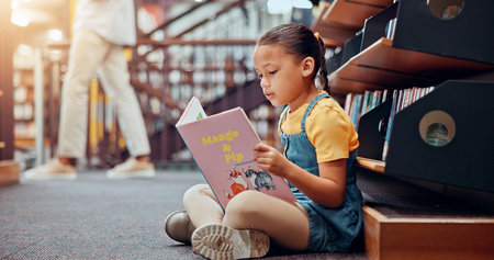 Girl, kid and reading book in library, education and novel with fantasy, vocabulary skills and learning. School, student and child development with literature information, storytelling and growth