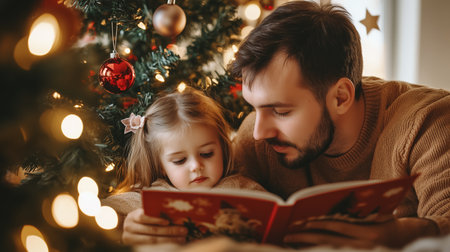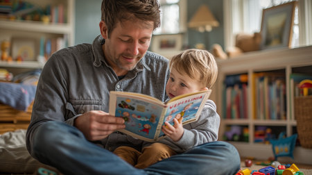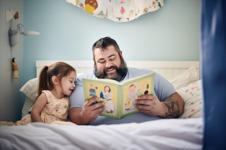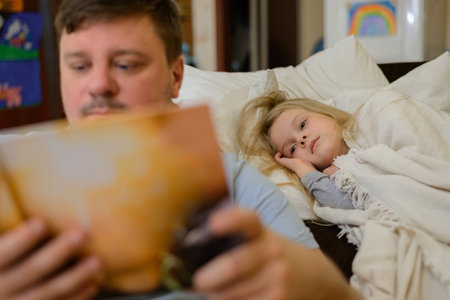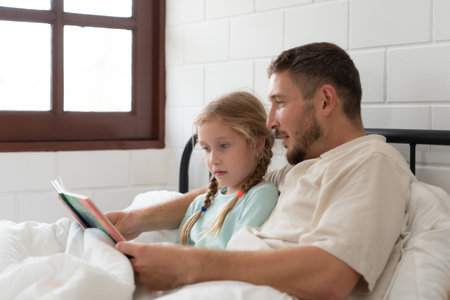 Little girl's father read stories to children before going to bed to unwind and sleep soundly until the morning.
