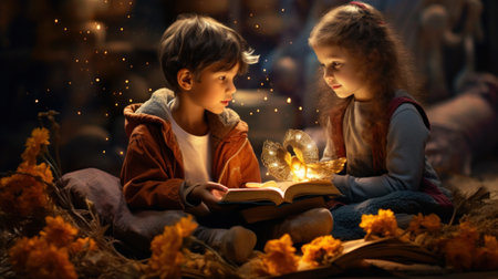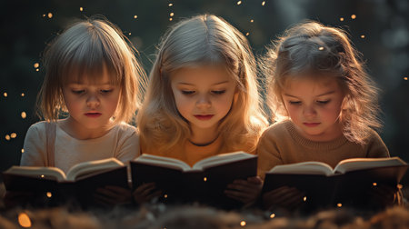 Theres so much magic in a book. Shot of two adorable little girls reading a book together in a room at night.