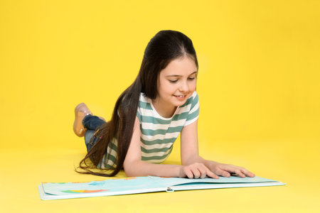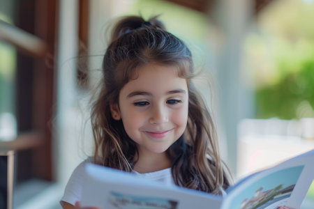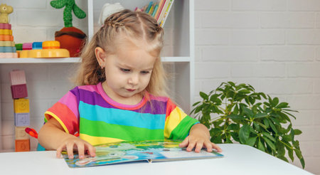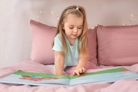 Adorable little girl in a bright t-shirt reading a book and pointing at the page
