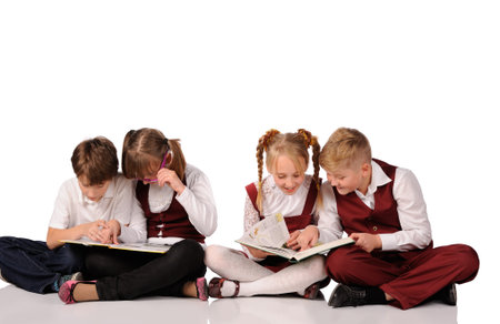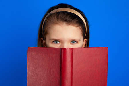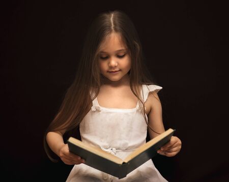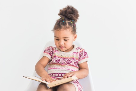 Portrait of a little girl in a colorful dress reading a book on a white background