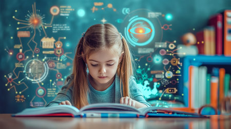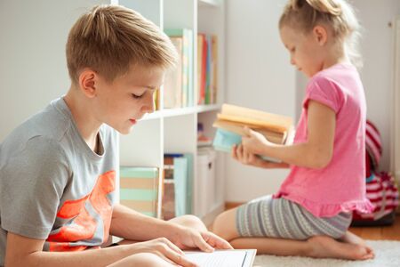 Young girl reading book at home. Distance education, home education. Self isolation concept.