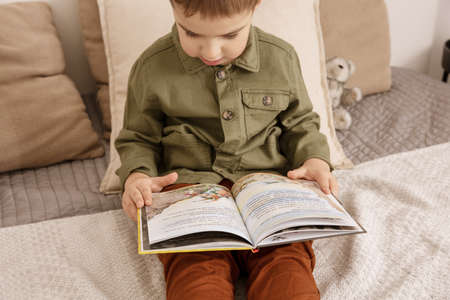 Little and cute caucasian boy reading a book on the bed at home. Interior and clothes in natural earth colors. Cozy environment. Child reads a fairy tale.