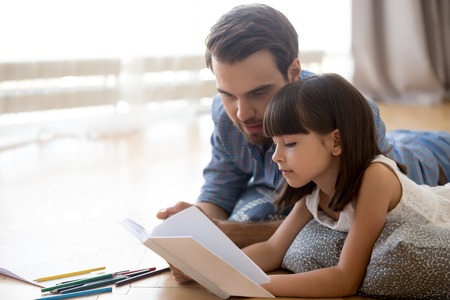 Diverse family indoors, young father with little adorable daughter lying together at cushions on wooden warm floor in living room at home reading a book fairy tale close up. Weekend activities concept
