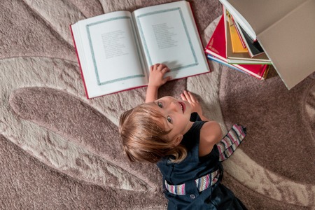 Little girl in a dark blue dress reading a book lying on the floor. Top view. Looking at the camera.