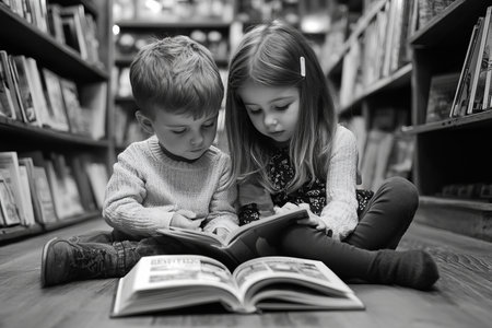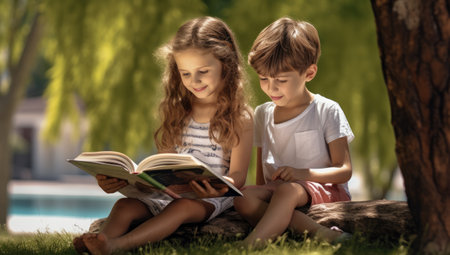 A young boy sits in a green armchair and reads a book to a little girl who sits on his lap. They are both looking at the book, and the girl has her hand on the book while the boy points at a page.