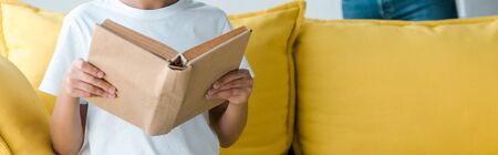 Child reads his favorite book at home. Kid looks at pictures in fairy tales.