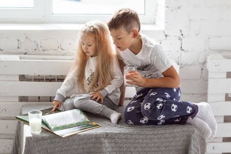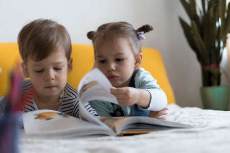 Two preshool, toddler children read large interesting book of fairy tales on yellow bed. Siblings little twins reader have fun, happy kid on quarantine at home. Friendship, family, education concept