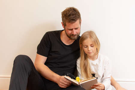 little cute girl with dad read a book sitting in the bedroom on the couch