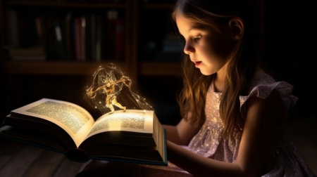 Little girl reading a bedtime story by the fireplace. Pre-christmas mood. New Years is soon