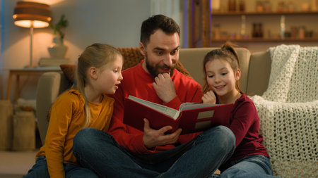 Caucasian family late night evening at home parent dad father man reading book kids watching photo album funny pictures happy cheerful amazed children little girls daughters schoolgirls enjoy learning