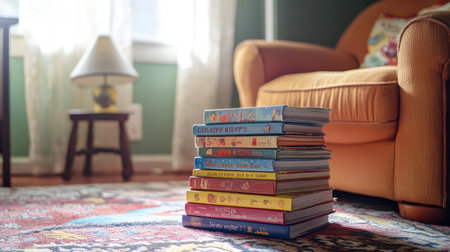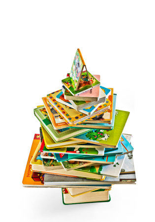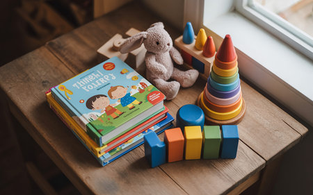 A stack of colorful children's books illuminated by sunlight, with small toys resting on top.