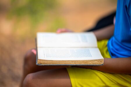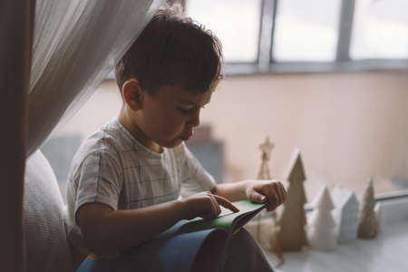 Cute boy is reading a book sitting on the windowsill near the window. Cozy home