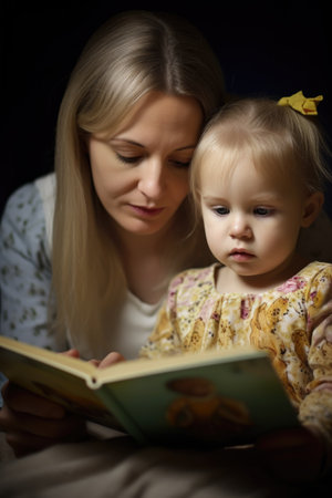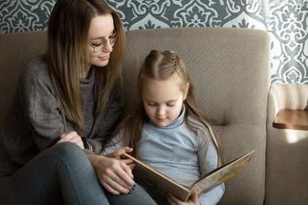 Little girl reads a book at home on the couch, her mother is next to her and listens to the child