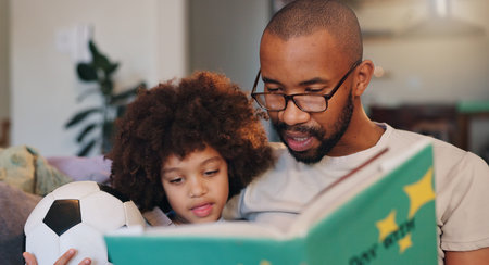 African man, son and story book on sofa with football, listening and bonding in family house. Father, boy and reading with care, fantasy and relax with love, literature and learning in living room