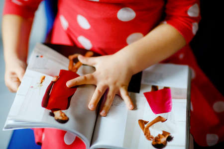Little stylish toddler girl reading and looking fashion magazine or catalogue. Adorable child having fun with choosing clothes.