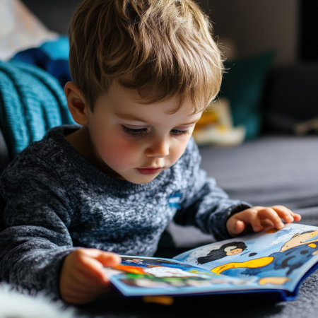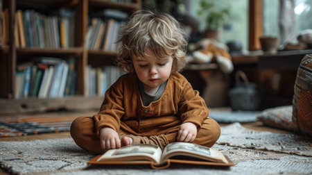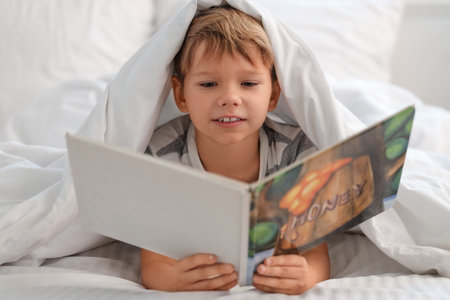 Child reading book. Kids read books. A little boy sits on a bed with your toys in living room watching pictures in story book
