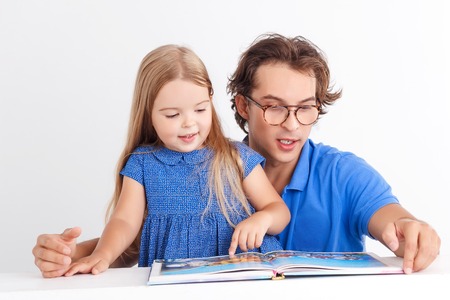 Way to be clever. Positive father with daughter sitting at the table and turning over pages while reading.