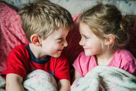 Two young children, a boy and girl, gaze into each other's eyes, smiling, in a cozy bed