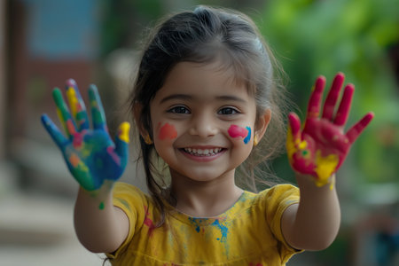 Portrait of cute asian child girl showing her hands painted in bright colors.